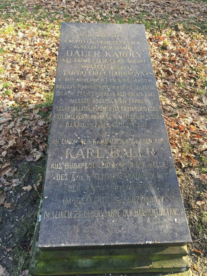 IN EINEM DER NAMENLOSEM GRÄBER RUHT KARL BAUER AUS BUDAPEST LEUTNANT IN DER RESERVE DES K. u. K. FELDJAGERBATAILLON Nr. 1. DER AM 1.NOVEMBER 1914. IM GEFECHTE BEI ROZWADOW IN SEINEM 23. LEBENSJAHRE HELDENTOD FAND.