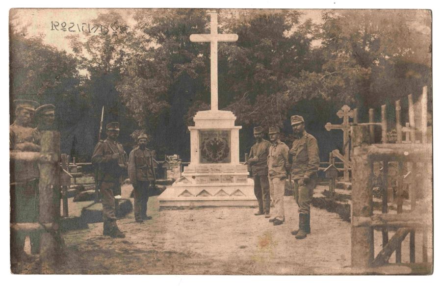 Zaczęło się to banalnie: przedstawiciel Wykonawcy poprosił o lepszej jakości zdjęcia, co starałem się załatwić niezwłocznie. Prosiłem przy tym Koleżankę Anetę o powtórne zeskanowanie w lepszej rozdzielczości obu pocztówek pokazujących początkowy stan cmentarza w 1915 i 1916 roku. Kiedy już po zakończeniu prac redakcyjnych miałem wreszcie okazję obejrzeć obie pocztówki(teraz już w 600 dpi), dostrzegłem, że daje to możliwość odczytania napisów i prawidłowego opisu obiektów, jakie umieszczono na postumencie centralnego krzyża – pomnika, postawionego jesienią 1915 przez oddziały etapowe c. i k. 4 Armii, pośrodku działki K. Jarosza zajętej na pochówki wojenne. Dotychczas przyjmowaliśmy bowiem że były to tabliczki z nazwami pól bitewnych i ich datami. Okazało się jednak, że są to tabliczki z krzyży z niektórych mogił przenoszonych w okresie października – grudnia 1915 roku. Tabliczki te miały charakterystyczny trójkątny daszek z dwu deszczułek, mający osłaniać je od opadów.