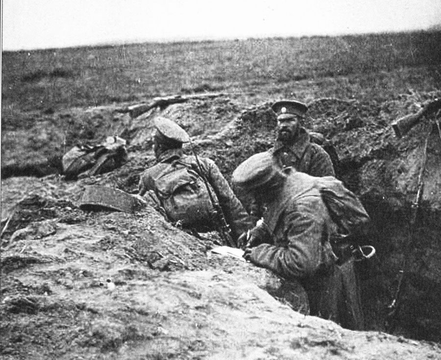 Zdjęcie brytyjskiego korespondenta wykonane w październiku 1914 r. w okopach rosyjskich na spokojnym odcinku frontu w Galicji. Zwraca uwagę niezwykle skromne wyposażenie piechurów.