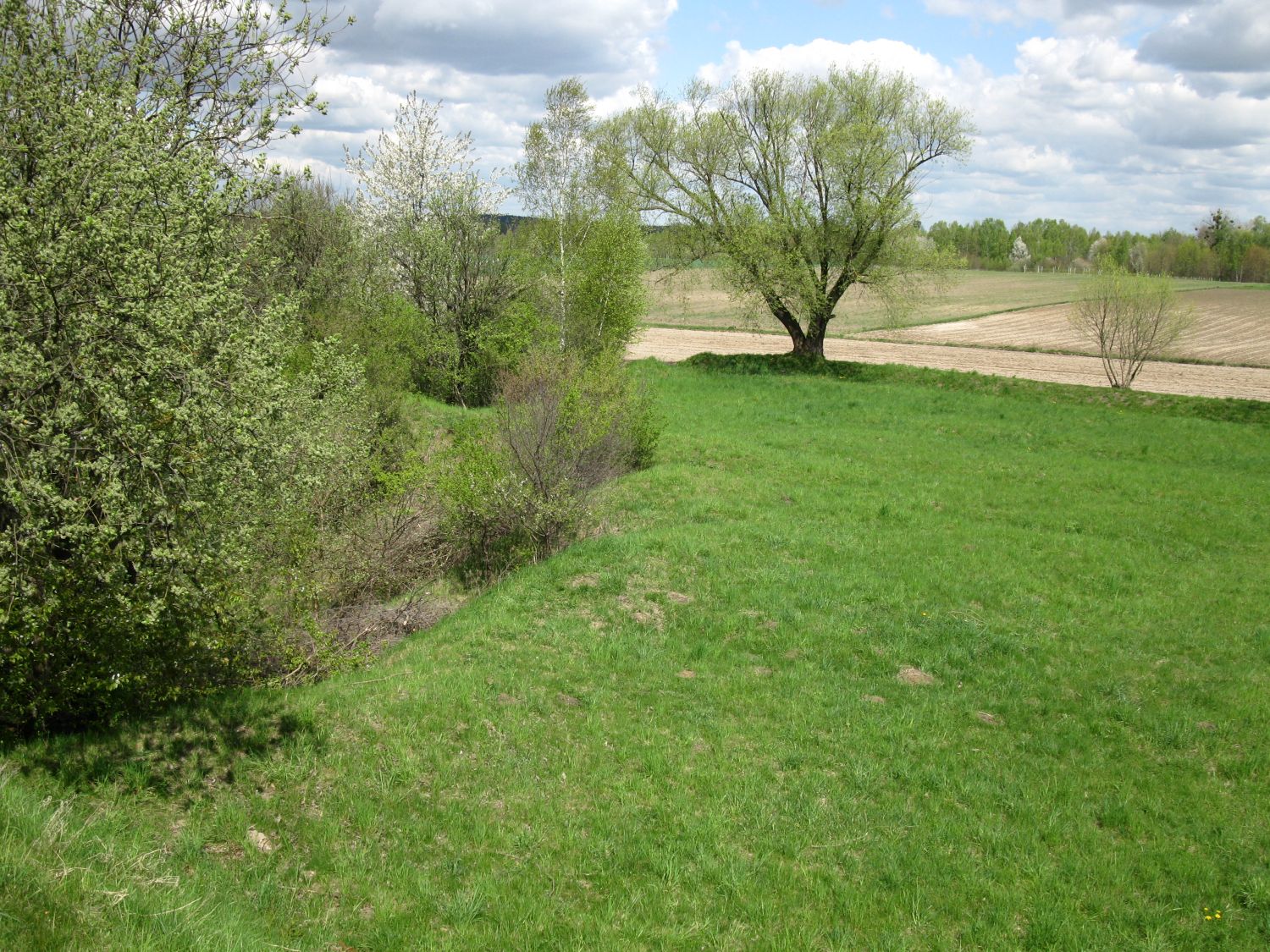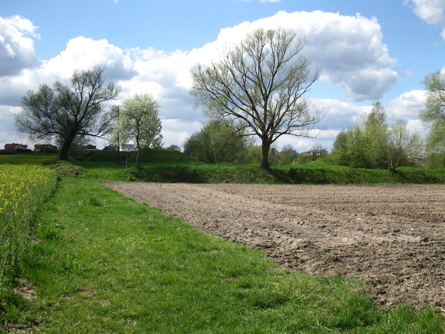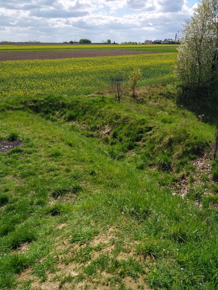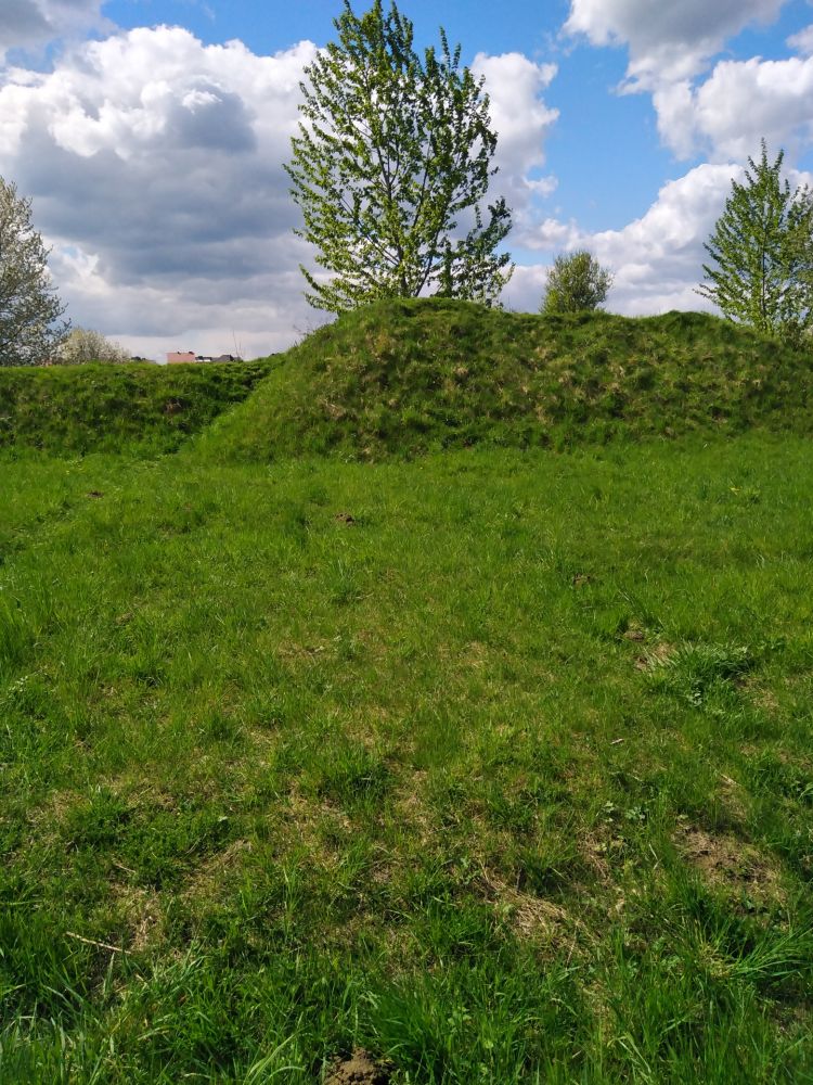 Parę zdjęć pokazujących zachowany kawałek cmentarza wojennego. Na jednym z nich wyraźnie widać krawędź zarośniętego wyrobiska, inne pokazuje zachowany fragment podstawy wielkiego kopca ziemnego z kolei jeszcze jedno zachowany fragment rowu okalającego wał-ogrodzenie.