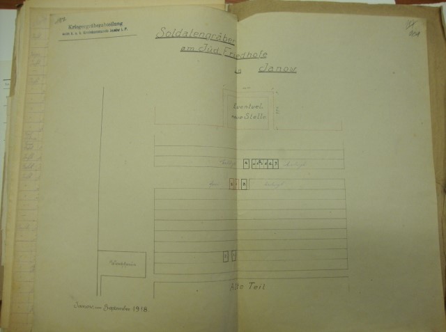 W ostatnim poście obiecaliśmy omówić pochówki poległych i zmarłych żołnierzy wyznania mojżeszowego w Janowie. Warto pamiętać, że w działalności austro-węgierskiego aparatu grobownictwa zwracano uwagę na zapewnienie pochówków na cmentarzach poszczególnych wyznań, o ile tylko w pobliżu znajdował się odpowiedni cmentarz. Podobnie stało się w Janowie. Kiedy we wrześniu 1915 r. sporządzano pierwszy spis pochówków wojskowych wykazano, że był tu 7 grobów pojedynczych. Zgodnie z adnotacją z początku maja 1916 r. rodzina ekshumowała Kdtt Asp. Lwa Stattera (?możliwe inne odczytanie nazwiska). Ponadto przed 1918 r., rodziny dwu pochowanych tu żołnierzy wystawiły kamienne macewy dla swoich bliskich (Katz Moses Pinkas i Scharf Jakiel).