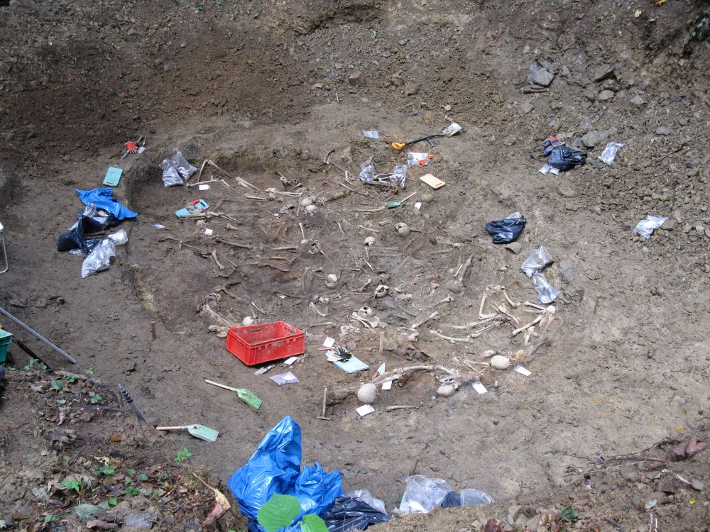 Podczas wykopalisk stwierdzono, że pochówki w leju były dwojakiego rodzaju. W górnej części leja szczątki były ułożone w sposób w miarę uporządkowany, a sądząc po zachowanych resztkach wyposażenia i obuwia, w warstwie wierzchniej przeważali żołnierze austro-węgierscy, tu też znaleziono parę Legitimationskapseln („nieśmiertelników). Natomiast w dolnej części położenie szczątków wskazywało że były one tu wrzucane bez ładu i składu, mówiąc potocznie „jak leci”. Niewątpliwie ta część grobu masowego powstała zaraz w pierwszych dniach po wysadzeniu szczytu, kiedy pośpiesznie zebrano zwłoki i zepchnięto je do leja. Na razie nie jest jeszcze jasne, kiedy powstały pochówki w górnej części leja: czy zwłoki zostały tam złożone w okresie między wybuchem a przed wydaniem rozkazu o odwrocie, czy też nastąpiło to już po 28 marca 1915 r.. Podobnie na razie nie da się jeszcze z całą pewnością podać ilu pochowano tu żołnierzy armii austro-węgierskiej a ilu armii rosyjskiej, choć wstępne szacunki istnieją.