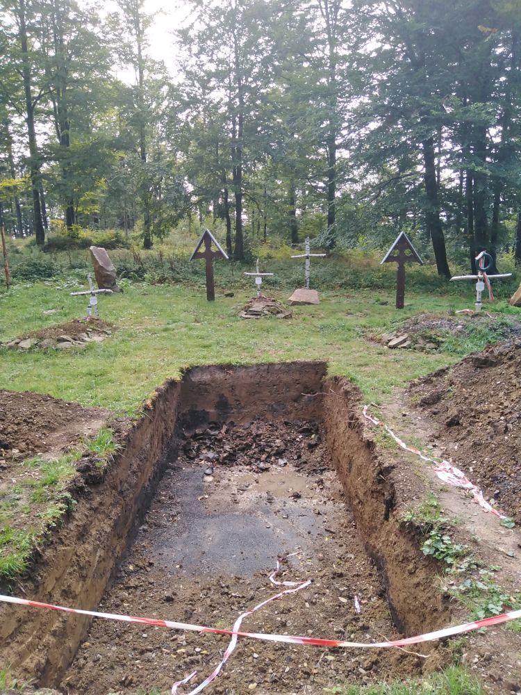 Polegli na Maniłowej. Zakończenie badań archeologicznych w leju po wybuchowym. Uroczystość powtórnego pochówku poległych żołnierzy w dniu 7.10.2023 r. na cmentarzu wojennym Maniłowa (Łysy Wiech, 810 m nmp), gm. Baligród, woj. podkarpackie