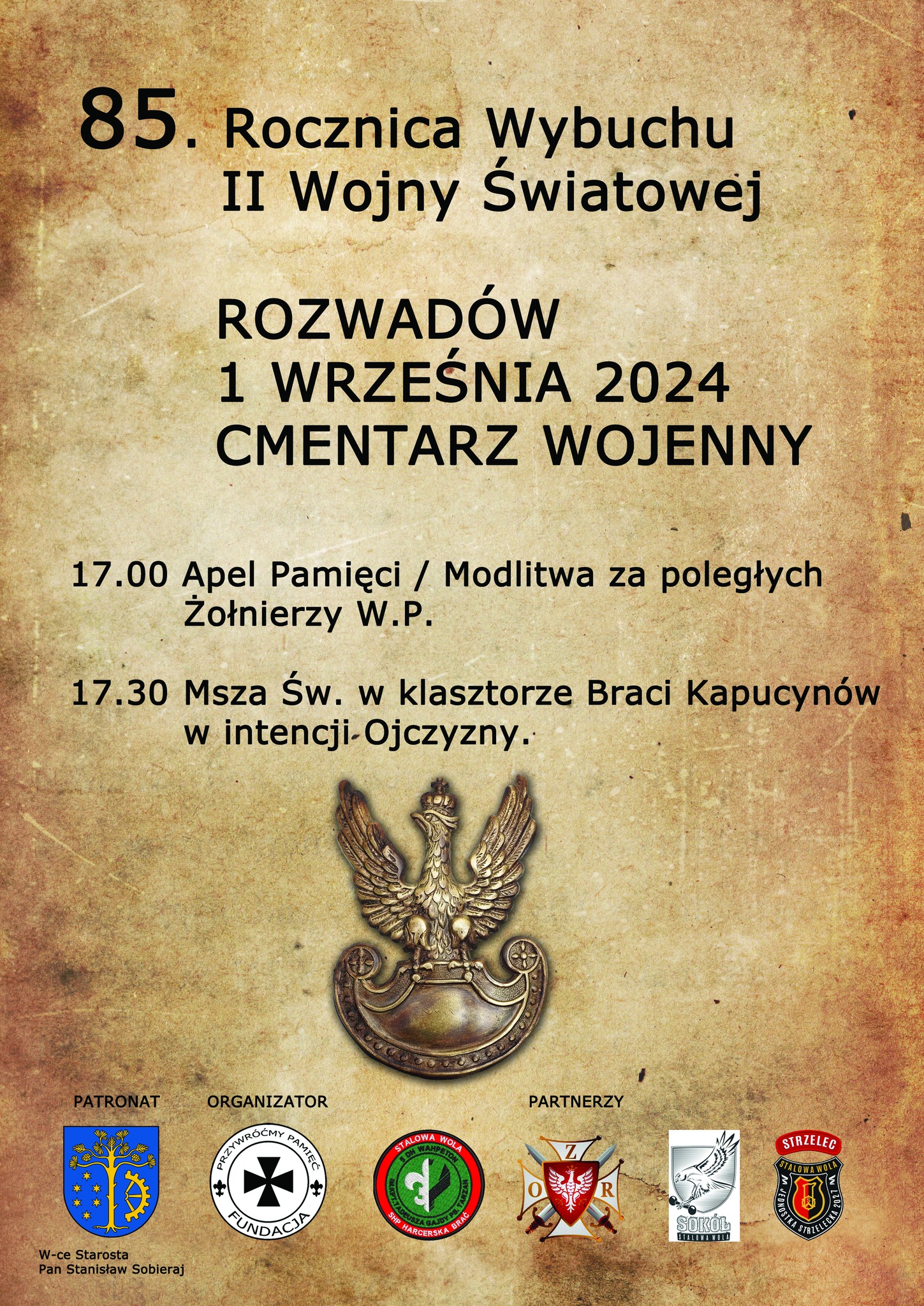 Zapraszamy Mieszkańców Stalowej Woli i okolic na uroczystości w związku z 85 Rocznicą Wybuchu II wojny Światowej, które odbędą się w Stalowej Woli Rozwadowie.
