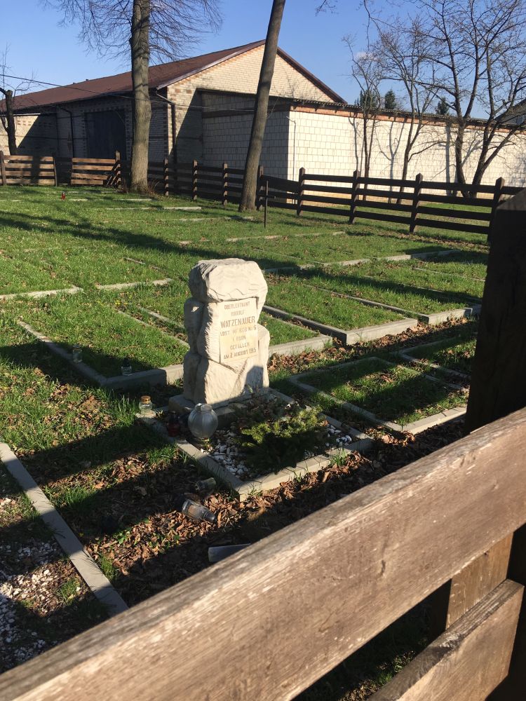 Pozostaje nadal niedokończony proces badawczy związany z pochowanym tu Rudolfem Watznauerem (jedyny zachowany oryginalny nagrobek z epoki – na załączonym zdjęciu) ur. w 1873 roku w Reichenbergu (dzisiaj Liberec w Republice Czeskiej) jako syn Leopolda sądowego urzędnika austro-węgierskiego. Oblt Watznauer zmarł nocą z 1 na 2 sierpnia 1915 r. z ran odniesionych w bitwie pod Marysinem. To czego nam brakuje, to jego zdjęcia, które mogło by być ukoronowaniem naszej pracy badawczej – mimo podejmowanych wysiłków, nie trafiliśmy na nie. W tej sytuacji ponawiamy apel do ludzi dobrej woli o pomoc w tej sprawie, bo była to postać nietuzinkowa – odsyłam do postu z 31 lipca 2022 r. albo do odpowiedniej zakładki poświęconej Marysinowi na naszej stronie http://wwwprzywrocmypamiec.pl .