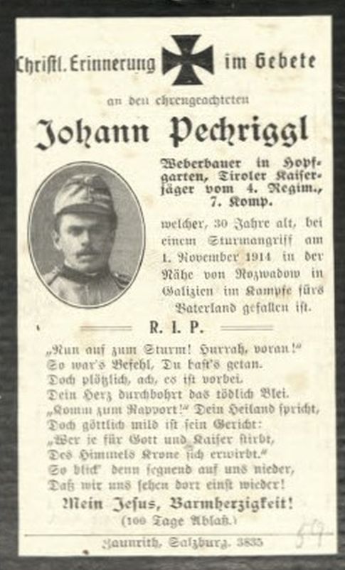Reserve Jäger Johann Pechriggl urodził się 13 września 1884 r w Hopfgarten, w ówczesnym powiecie Brixen, w rodzinie chłopskiej. Prowadził rodzinne gospodarstwo rolne, był żonaty. Po mobilizacji jako rezerwista trafił do 7 kp III baonu 4 pcst. Poległ 1 listopada podczas odpierania rosyjskiego szturmu przypuszczonego nad ranem. Z tego względu nie było znane miejsce jego pochówku, zapewne pozostał na przedpolu odzyskanych w kontrataku pozycji Tyrolczyków. Rodzinę poinformowano jedynie, że poległ „w pobliżu Rozwadowa”.