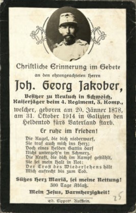 Jg. Johann Georg Jakober, urodził się 20.01.1879 w Kirchbichl (obecnie część Schwoich) jako syn Johanna i Anny Jakober. Pracował w kopalni, prowadząc jednocześnie niewielkie gospodarstwo rolne, był żonaty. Zmobilizowany z rezerwy jeszcze w końcu lipca 1914 roku trafił do 3 kompanii I baonu, 4pcst. Wyróżnił się w pierwszych walkach, za co otrzymał Wielki Srebrny Medal za Dzielność. Poległ 28 października 1914 r., pochowano go w największej mogile masowej nr 281.