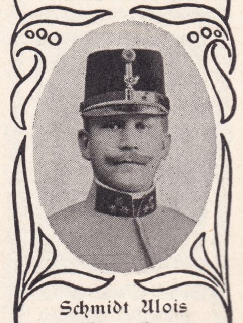 Dziś przy okazji publikacji jego wizerunku postanowiłem wreszcie zebrać w całość posiadane o nim informacje. Alois Schmidt był jednym z pięciorga dzieci urzędnika celnego Aloisa Karla Schmidta, pochodzącego z zachodnich Czech, a służącego w różnych częściach Przedlitawii (m. in. w Pradze i Insbrucku, gdzie krótko przed śmiercią został zarządca tamtejszego Urzędu Celnego). Chyba z tych względów dla młodego Aloisa, urodzonego w 1873 roku w Pradze, wybrano karierę wojskową, oddając go do Niższej Wojskowej Szkoły Realnej. Potem wstąpił do Szkoły Kadetów Piechoty i jesienią 1895 uzyskał stopień Kadett Offiziersstellvertreter (Kadet-zastępca oficera), otrzymując przydział do 22 czeskiego baonu strzelców polnych (k.u.k. FJB 22), stacjonującego w Pradze i Egerze (obecnie Cheb w Republice Czeskiej). Tu na wiosnę 1896 awansował na podporucznika, zostając dowódcą plutonu. Następnie jego kariera przebiegała typowo dla oficera piechoty – w 1905 roku otrzymał awans na Oberleutnanta, wkrótce zostając dowódcą kompanii. Wiosną 1910 roku awansował na Hauptmanna i w kilka miesięcy potem delegowano go na stanowisko wykładowcy i wychowawcy do Niższej Wojskowej Szkoły Realnej. Z tego okresu pochodzi też prezentowana fotografia – zwraca uwagę strzelecka trąbka poniżej bączka na czapce, znak przynależności do jednostek strzeleckich gromadzących dobrych strzelców i prowadzących staranne wyszkolenie w tym zakresie. Niższa Wojskowa Szkoła Realna miała tradycje sięgające 1881 roku, wcześniej działająca w Koszycach, a w 1904 roku przeniesiono ją do Strass w kraju koronnym Styria, lokując w obiektach dawnego zamku, wcześniej użytkowanych jako koszary artylerii, dragonów, wreszcie jako siedziba Szkoły Kadetów Piechoty. W skład personelu szkoły wchodziło 16 oficerów, 8 urzędników wojskowych i 3 nauczycieli cywilnych. Tu służył do lata 1914 r, kiedy po ogłoszeniu mobilizacji poprosił o przejście do jednostki liniowej. Nie udało mi się odnaleźć rozkazu personalnego w sprawie przeniesienia przenoszącego w Verodnungs blat für k.u.k. Heer - Personalangelegenheiten z 1914 r., a taki musiał być wydany, bo kpt. Schmidt otrzymał przydział do elitarnego 4 pułku cesarskich strzelców tyrolskich, co potwierdza umieszczenie jego nazwiska na liście poległych oficerów w monumentalnej monografii „Die Tiroler Kaiserjäger im Weltkriege”. Na front dotarł już z II lub III marszbatalionem i objął wakujące wskutek strat stanowisko dowódcy 10 kompanii. Zginął 2 listopada 1914 roku podczas odpierania ataków podjętych w rejonie Rozwadowa przez rosyjską 46 Dywizję Piechoty. Pochowano go razem z większością poległych wtedy żołnierzy w mogile masowej nr 281. Dziwny jest brak zamieszczenia w prasie nekrologu ze strony najbliższych – oprócz informacji na Verlustliste nr 116, pojawiła się jedynie oficjalna wzmianka w Streffleur's Militärblatt z 23.01.1915 roku. Zatem prawdopodobne, że nikt z jego bliskich wówczas już nie żył, a on sam zapewne nie był żonaty, co jest wielce możliwe, jako że oficer w armii austrowęgierskiej związek małżeński mógł zawrzeć dopiero w stopniu kapitana, a i to było obwarowane znalezieniem kandydatki o odpowiednim cenzusie majątkowym.