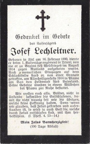 Drukuj Powrót do poprzedniej strony Lechtleitu(n)er Josef Treść Lechtleitu(n)er Josef, Jg. TKJ 1, *(?) Tyrol, + 1.12.1914, gr. (?)
