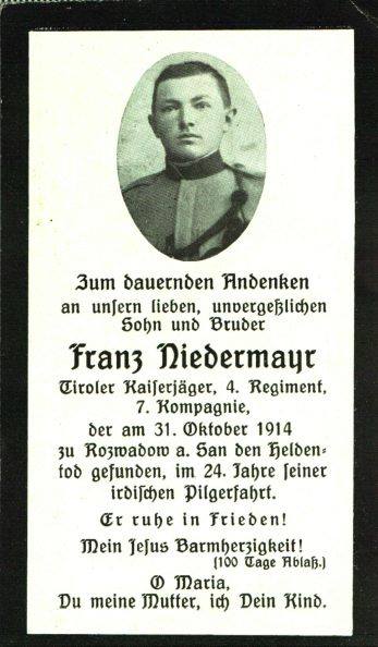Drukuj Powrót do poprzedniej strony Niedermayr Franz Treść Niedermayr Franz, ERJg., TKJ 4, *1890, Eppan, Kaltern, + 30.10.1914, gr. (?)