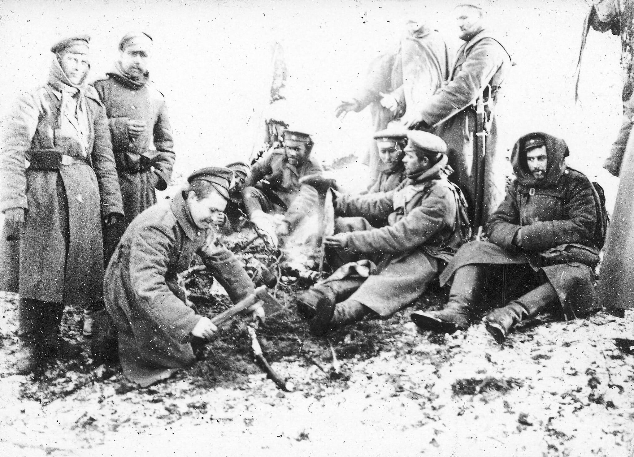 Jedynym łatwo dostępnym źródłem ciepła dla żołnierzy rosyjskich było rozniecone ognisko. Żołnierze siedzący przy nim: widać, że suszą buty i onuce. Zwracają uwagę baszłyki – sukienne dodatkowe kaptury będące skrzyżowaniem szalika i kaptura – stanowiły one cenne uzupełnienie umundurowania zimowego armii rosyjskiej. Pośród widocznych żołnierzy jest co najmniej 2 kawalerzystów.