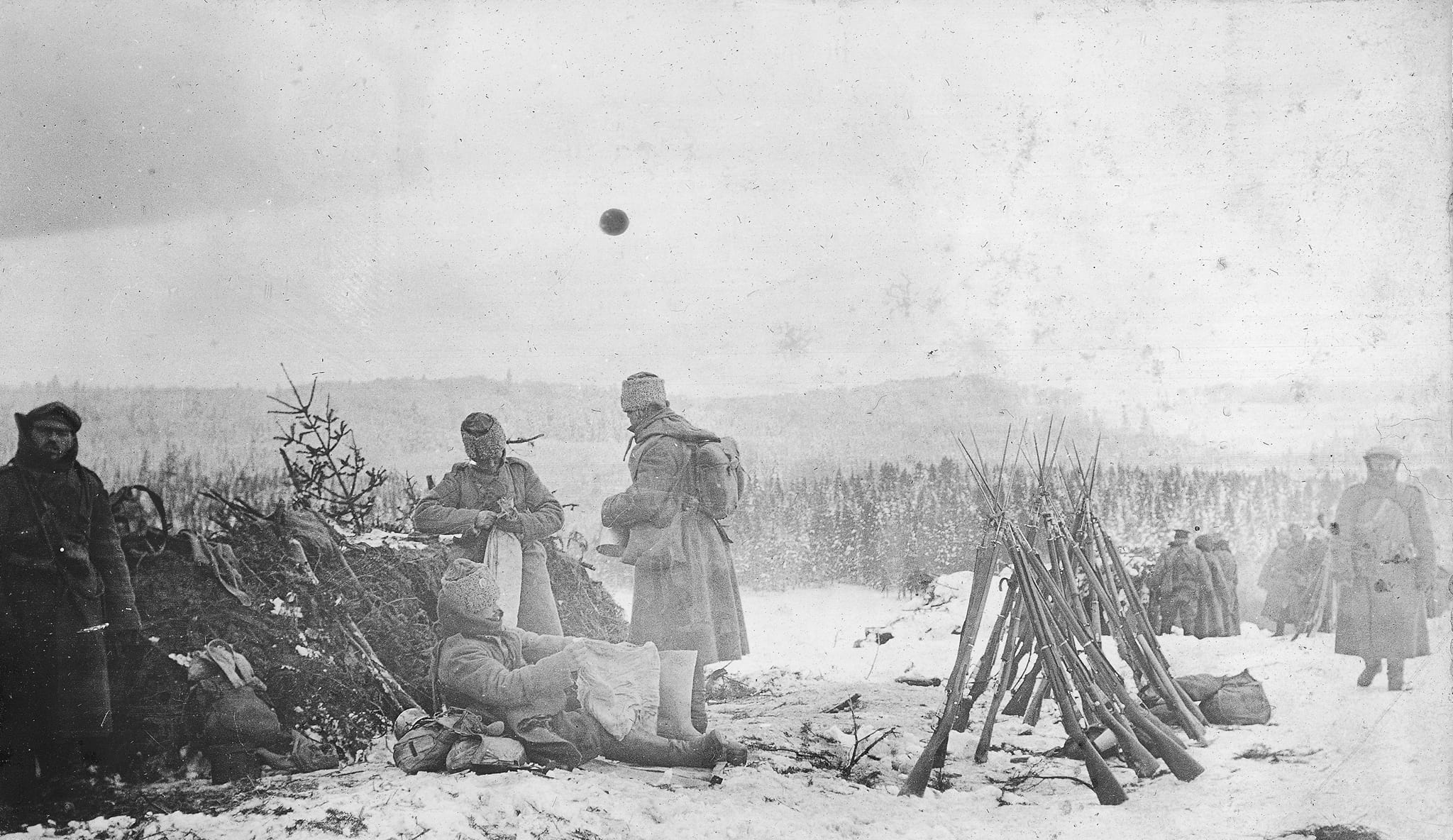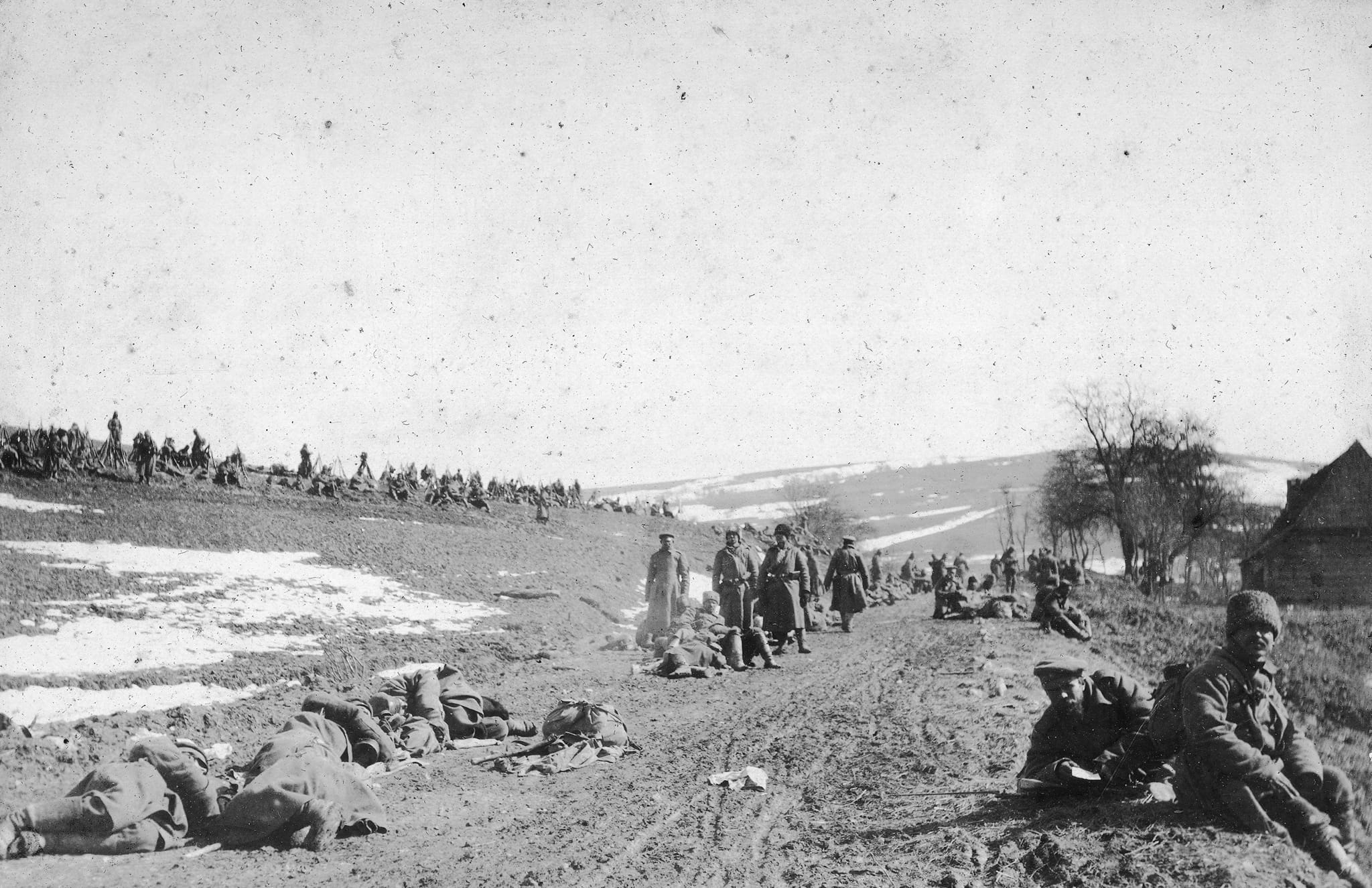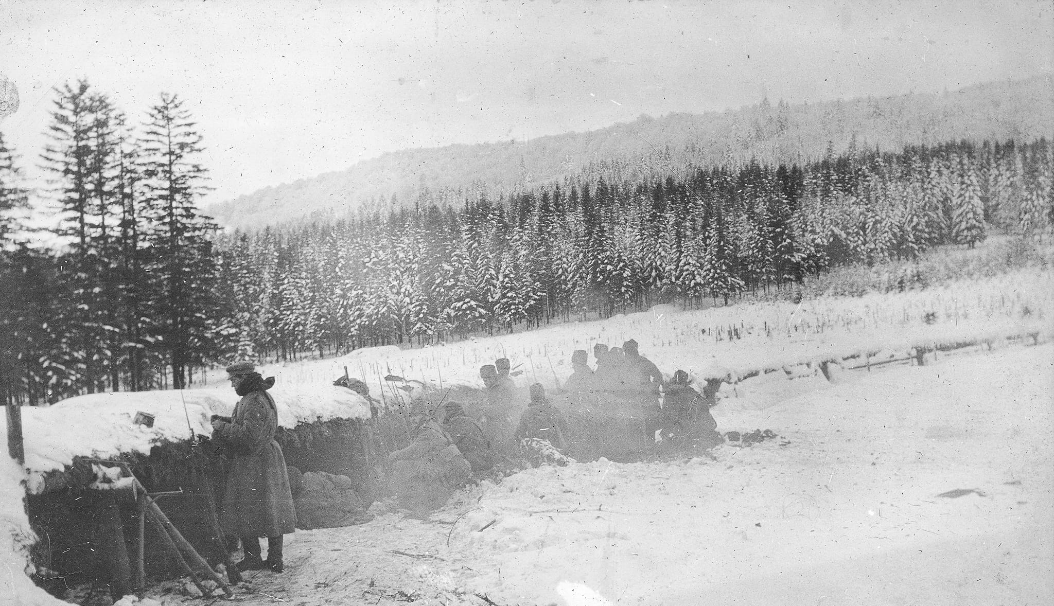 Odpoczynek na górskiej przełączy podczas marszu na teren Górnych Węgier /tj. Słowacji/. Jak widać walczyć trzeba było nie tylko z przeciwnikiem ale z terenem i trudnymi warunkami pogodowymi. Problem ten dotykał w równym stopniu obie walczące strony, ubogie karpackie wioski nie zapewniały możliwości kwaterunku dla wszystkich kombatantów, zresztą wykorzystywano je głównie dla rezerw, oddziałów odsyłanych na odpoczynek czy zakładów sanitarnych. Walczącym na pierwszej linii pozostawała nędza zimowej egzystencji pod gołym niebem.