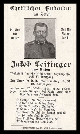 Drukuj Powrót do poprzedniej strony Leitinger Jakob Treść Leitinger Jakob, kuk IR 59, *(?)(?), +23.10.1914